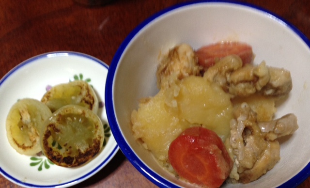 鶏ジャガと青トマトの焼きピクルス Category:台所遊び Date:2016年12月26日 夏に漬けた青トマトがやっとこ出番です厚めの鉄鍋でじゅうーーと焼くと固かった実が少し緩み熟したような甘さになります鶏ガラスープで蒸し煮にした鶏ジャガは全体にほっこり前の日から仕込んで朝、もう一度火を通す冬の煮物の定番です今朝はこのコンビで見た目地味だけど深い深い味を感じてください黄花娘さんはこれトマトですか???⁇と考えながら食べてました初めての味気に入ったかな?[0回]PR