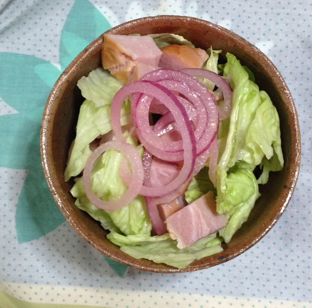 赤玉葱とハムレタスサラダ Category:台所遊び Date:2017年01月02日 塩と酢で漬けておいた赤玉葱がちょこちょこ登場します今日のは角切りハムとちぎったレタスというざっくりしたサラダ赤玉葱をのせるだけで充分な味になりますパンに挟んでも良さそうなサッパリした野菜を食べましょう[0回]PR