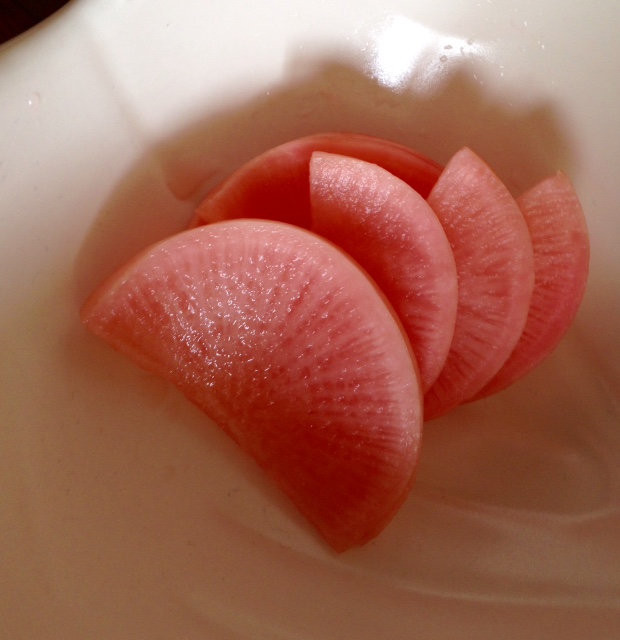 赤大根の甘酢漬け Category:台所遊び Date:2017年03月14日 まわりだけ赤くて中はきれいな真っ白だった赤大根を甘酢に漬けて2、3日溶け出した赤色が全体に回って可愛らしいピンクに染まりました食感は蕪のようなしっとり感は無くしゃきっとしたぱりぱり感です甘さも控えてるのであとくちさっぱり並べていると紅梅や桃や八重桜のような春めいた花弁に見えてきました[0回]PR