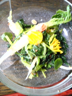 ちび大根の胡麻和え Category:台所遊び Date:2013年05月07日 小松菜を間引いてたばーちゃんからいー感じのひょろっとした大根やら、紫蘇双葉やら、捨てるにはもったいないと託されました キンレンカも花びらがいっぱいになっちゃったんで さっくりまぜて箸休めの一品 食材の説明でしばし歓談 土手まで音出しに行ってきたピアニストくんはシンセとスピーカーとアコーディオンも持ってて腹ぺこだったらしく メインの親子丼もぺろりとたいらげてギタリストに変身しましたよ [0回]PR