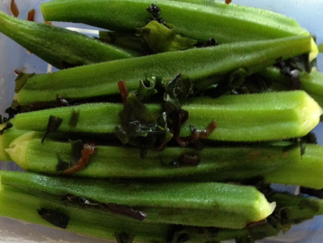 オクラの若布和え Category:台所遊び Date:2017年08月31日 作曲子熊くんの鉄分補給シリーズオクラを茹でて乾燥若布と塩昆布で和えましたオクラの表面のごわごわの毛を粗塩で板摺りして塩が残ったままお湯に入れると鮮やかな緑になりますぽりぽりとした歯応え水気を吸って半分ふやけた若布や昆布の香、旨味シンプルながら立派な季節の一皿です残ったら酢醤油をかけて冷やしておくとまた違った味わいに[0回]PR