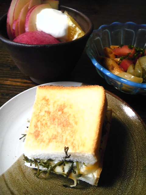 芽かぶチェダーチーズトースト Category:台所遊び Date:2013年06月06日 トロンとした芽かぶのねばねばにチェダーチーズをダイスカットで混ぜて厚切り食パンに挟んで蓋付きフライパンで両面焼き 林檎薄切りを甘夏柑でマリネしておいて、ヨーグルトをトッピング トマトソースのペンネは焼いた青トマトピクルスと生の刻み生トマトをのせて、トリプルトマト味 ミントの葉っぱを揉んで香りだけ移した珈琲牛乳 ちょっとしたランチタイムで、午後からもしっかり働けるように! 鍵盤の音が降ってきて雨みたいですピアニストくんは作曲中かな [0回]PR