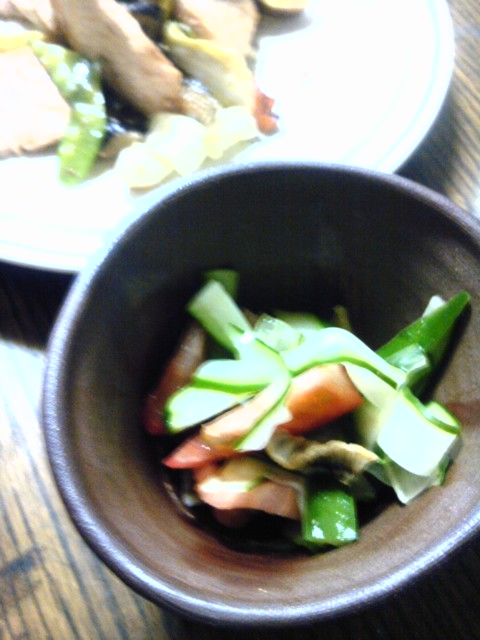 ヒモの干物で酢の物 Category:台所遊び Date:2013年06月06日 ホタテのヒモのおつまみがカチカチに乾いてしまったので瑞々しい胡瓜を薄く切って一緒にしておきました程よく水分と旨味を移し合った頃合いをみて夏蜜柑のまだ硬い実を搾りかけて、できあがり 豚肉の茄子味噌炒めにちょうどあう味になりました 冷えた濁りワインちょっと汗ばむような湿度の迫る季節こそしっかり食べておきましょうと、二杯ほど [0回]PR