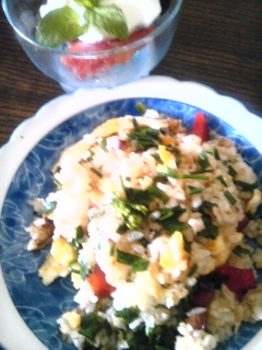 韮の花とししとうの卵チャーハン、トマトのソルベ・ヨーグルト添え Category:台所遊び Date:2013年09月07日 雨上がりの秋晴れに韮の花が白く白く咲きはじめました柔らかい茎や長い葉と一緒に卵チャーハンを炒めた最後に、たっぷり入れてひとまぜすれば韮の香りいっぱい冷蔵庫で待ちくたびれてるのがきれいになってくれるから助かるわというばーちゃんの、今夏ラスト一個の枝完熟トマトが、冷凍庫でシャリシャリになってお待ちかねでした扮糖をそっとかけてから室温に置きゆるゆるとしてきたところでヨーグルトをかけますピアニストくんはん、旨いょとたいらげて作曲に復帰じーちゃんはスイカじゃあないしトマトかな?と、さすが見た目ですでに正解でした最近はもう、当たり前のようにイレギュラーメニューに付き合わされているので、読まれてるか…今度は何を作って驚かせようかなぁ?いえいえ、基本的な家庭料理が王道なのです今日も幸せな食べるための時空間をともにしましょう[0回]PR