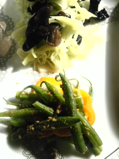 隼人瓜と木耳の酢の物、ツユ豆とパプリカの胡麻和え Category:台所遊び Date:2013年11月29日 こんな何でもなさそうなおかずを機嫌よく作れると明日のお天気まで良くなりそう台所は足元が少しヒンヤリしています硝子越しの陽光がやわらかく温めてくれます[0回]PR