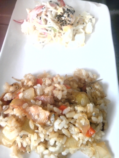 スイートソイソース味炒飯と冷や麦の卵サラダ Category:台所遊び Date:2013年12月14日 炭水化物炭水化物ですがお腹いっぱいにするにはこれですあったかいくて甘辛いのと冷たくて酸っぱいのと口当たりを変えてね野菜もたっぷりですこっそりたっぷり隼人瓜も入ってるんですよ[0回]PR