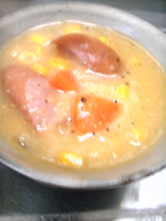 ソーセージ入りコーンスープ Category:台所遊び Date:2014年01月22日 粒々コーンとコーンクリームと半々でコーン感たっぷりこれでサクッとしたトーストがあれば満足な朝食というところ歌姫ちゃん鼻歌まじりで朝、食べてないー、スープある?お鍋から香が届いたようですね[0回]PR