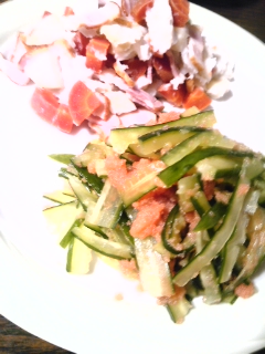 べー里とタラコ胡瓜 Category:台所遊び Date:2014年02月06日 ナビナビナースさんが天然酵母のバゲットを仕入れてくれました今ある食材だけでサラダを作ってオープンサンドにしてみましょうベーコンと里芋、金時人参を塩味で煮込んで、粗熱をとってからレモンを搾ります少しだけ潰してからめとりやすくしたポテトサラダ風胡瓜を薄切りにして塩もみしナビナビナースさんに力いっぱい絞ってもらいます辛子明太子で和えたらこちらもレモン少々じーちゃんが酒に合う~と、おかわりしてますがパンも食べてね明るい雪が舞う春先です[0回]PR