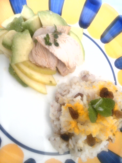 フレッシュハーブでランチプレート Category:台所遊び Date:2013年03月22日 蒸し鶏とアボカドと王琳をオレンジ果汁と摘みたてタイムの新芽で和えてサラダ仕立てに隠し味は一年寝かした青梅醤油 十五穀米にはサルタナレーズンとターメリックをたっぷりそして摘みたてのアップルミントを冠に 新しい季節の新しい香り何かが始まりそう …と、たくさん作ってたら 腹ぺこバンドマンがやってきますやはりタイミングよいですね~夜にむけてアレンジしよかナンプラーにピーナッツと大蒜とチリソースを添えてあげよう新しい曲、聴かせてね![0回]PR