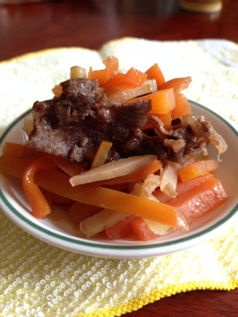 牛人参 Category:台所遊び Date:2016年03月11日 拍子木切りの生姜が人参の半分くらい入ってます出汁と酒に醤油をちょっぴり不思議なくらい甘辛です牛肉の脂や火の通った人参や温もった酒や醤油のそれぞれの甘みと生姜の辛みや香が充分な味を作ってくれるのでしたピアノ弾きくんも旨し旨しとご飯お替り歌姫ちゃんはタッパーウェア準備してますねお天気屋台風やすみんは持ち出し、持ち帰りも有りですやすみんさんも手弁当でお散歩など大好きですもの[0回]PR