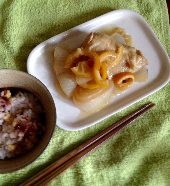 鶏玉葱のレモン煮 Category:台所遊び Date:2016年05月04日 鶏皮の多いところをレモンや新玉葱のブツ切りと一緒に酒で煮てちょっと煮詰まりかけたところに醤油をたらり程よく甘くしゃんとした味わいにレモンの皮がちょうどいいくらいに苦味が抜けて鶏皮と一緒に口に入れるとバランスよく美味いー黒大豆ご飯とあわせましたがビールもイケます軽めの赤ワインとか歌姫ちゃんがボトルの首つかんでますが他にももう一品作ろうかな[0回]PR