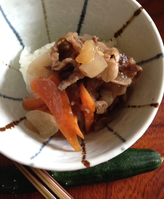 牛丼、胡瓜もね Category:台所遊び Date:2016年05月29日 玉葱がとろんとなるほど煮えましたご飯にのっけたら全部が美味しい味になる箸置き代わりは胡瓜ですはいはいもろみ味噌も行きますよー[0回]PR