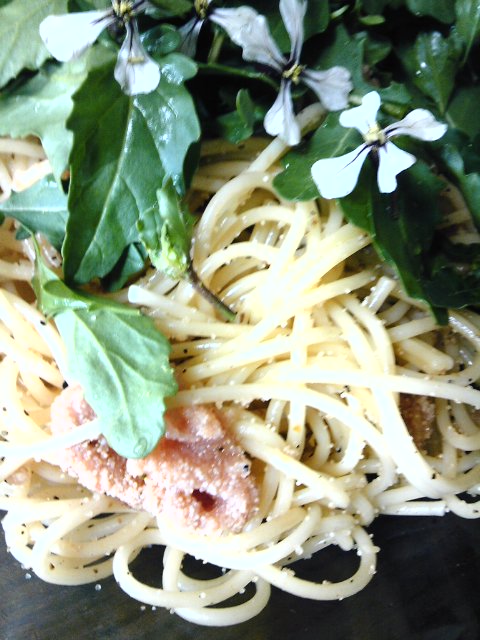 たらこスパゲティー ロケット花冠 Category:台所遊び Date:2013年04月04日 たらこ皮ごとササッと焼いてタタキ状態です ロケットの花って大根の花と親戚でしょうね次々と咲くのを生食です なんだか季節と追っかけっこ!食べ尽くしてあげるわよ~ [0回]PR